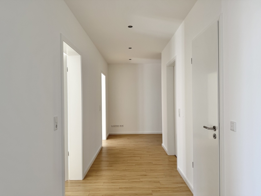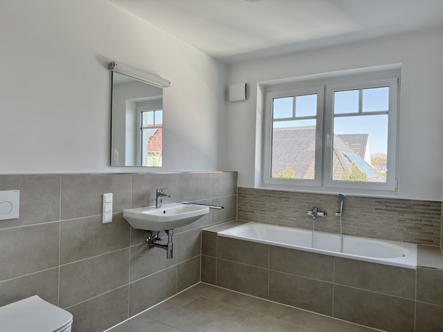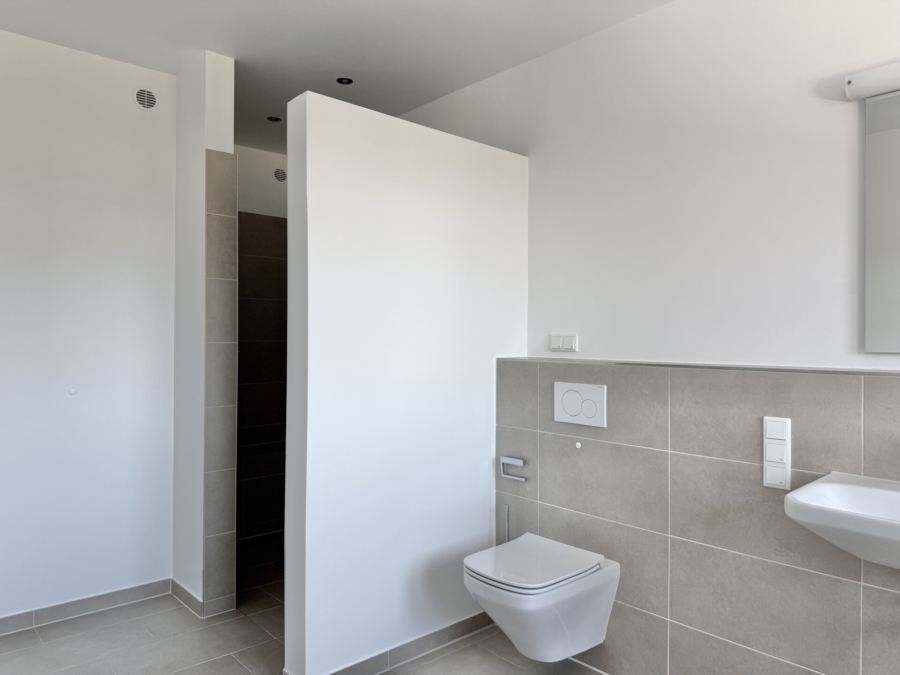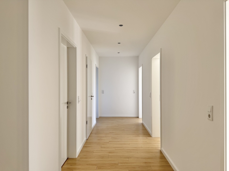Alle Räume verfügen zudem über eine Fußbodenheizung, die rundum für eine angenehme Temperatur sorgt. Im Flur, sowie im Bad befinden sich zudem Einbaustrahler, die für eine gemütliche Atmosphäre zu jeder Tages- und Nachtzeit sorgen. Im Flurbereich sind die Einbaustrahler zudem dimmbar. Eine Verkabelung für eventuelle Beschattungsanlagen ist ebenfalls bereits vorhanden. Die dezentrale und kontrollierte Wohnraumbe- und Entlüftung sorgt für ein angenehmes Raumklima und kann für die Wohn- und Schlafräume gesteuert werden, sowie separat für das Badezimmer.